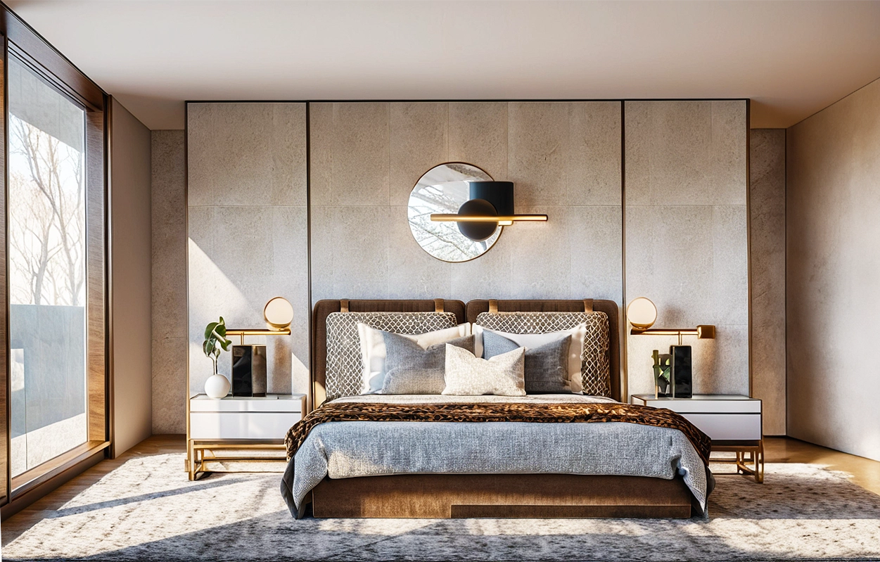 • architecte d'interieur cannes alpes maritimes decorateur design maison chambre a coucher lit beige zed design transformation optimisation d’espaces réaménagement d’intérieur projet de décoration sur mesure